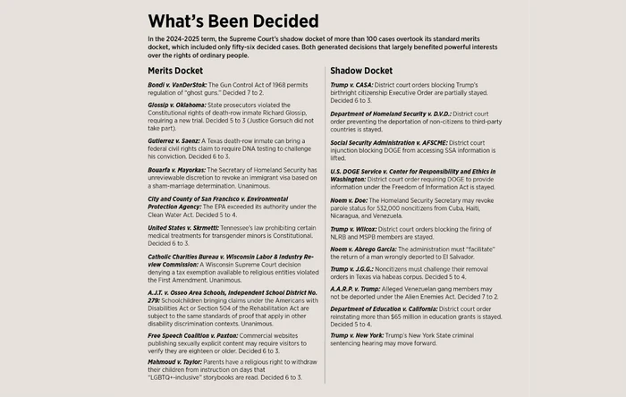The court waited until June 23 to release its most draconian immigration decision of the term (DHS v. D.V.D.), holding 6 to 3 that noncitizens under final orders of removal can be deported to third-party countries, even ones with records of severe human-rights violations. And on June 27, in a highly technical but very important procedural ruling (Trump v. CASA) on Trump’s birthright citizenship order, the court held 6 to 3 that district court judges generally lack the power to issue nationwide injunctions. Although the decision did not address the constitutionality of the executive order or the substantive scope of the 14th Amendment’s provision extending citizenship to virtually all persons born in the country, it sent three legal challenges to the order back to three district court judges who had blocked the order from taking effect. The litigation continues.